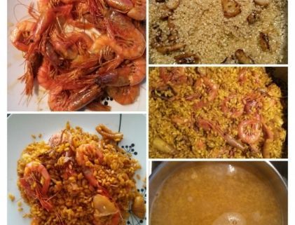 Cuando ya casi está el arroz cocido añadimos las gambas y retiramos del fuego.